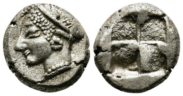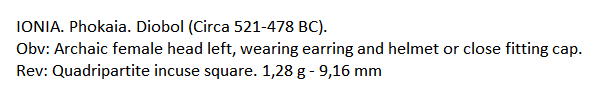 Da Focea nella Ionia, un attraente esemplare di diobolo di alta epoca, con al diritto bella testa femminile ed al rovescio quadrato incuso quadripartito .