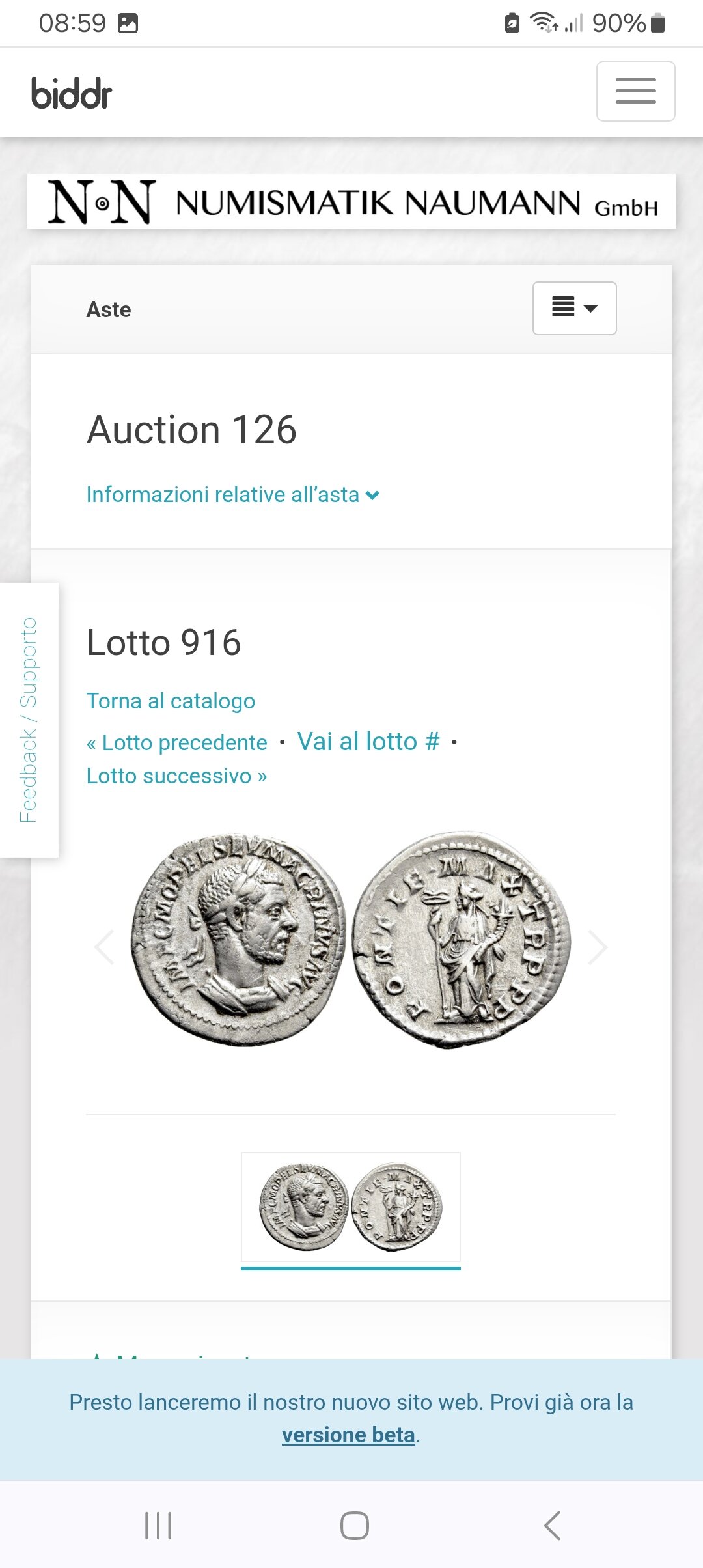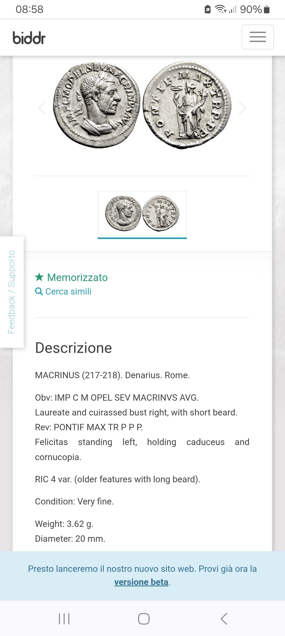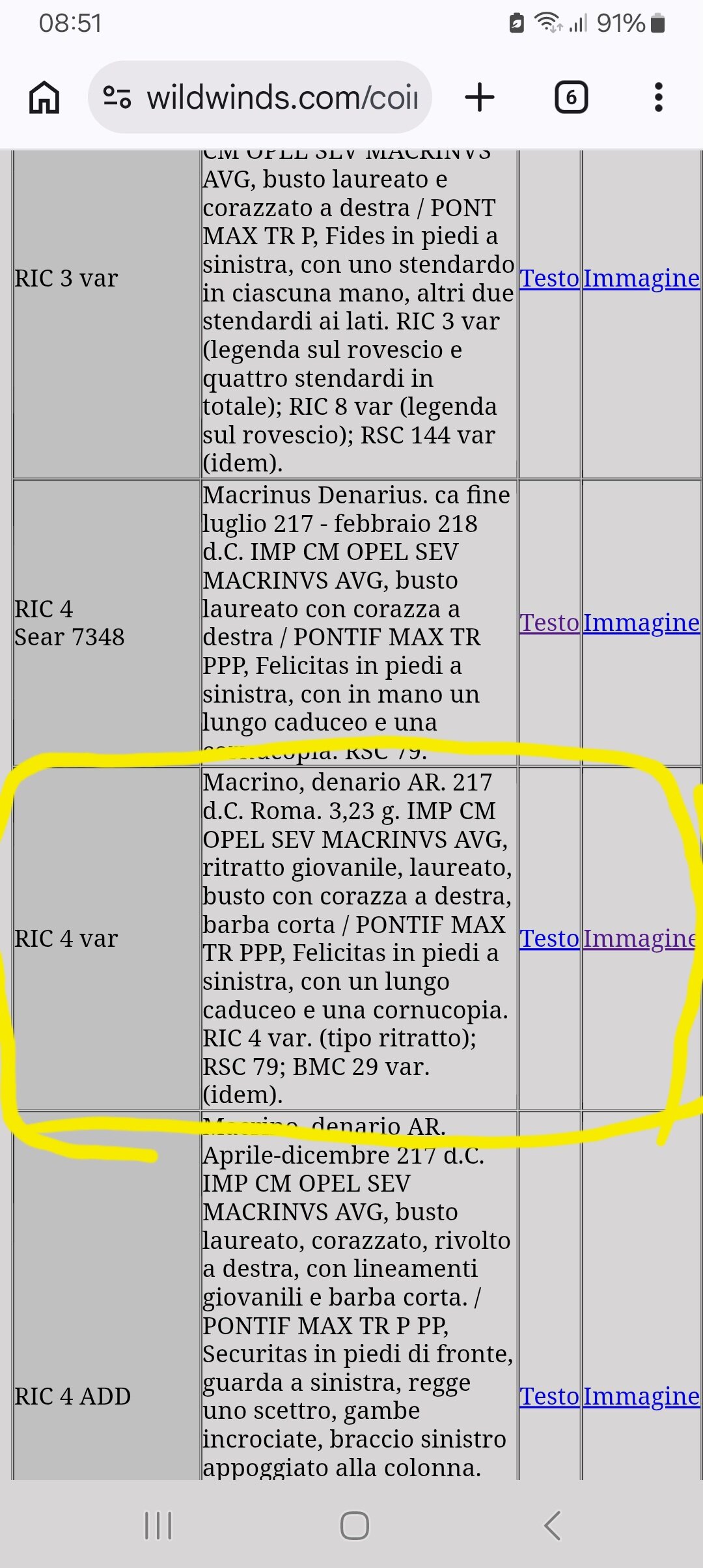 alez72 Inviato 1 ora fa Supporter #1 Inviato 1 ora fa Buonasera, Chiedo aiuto a chiunque abbia il volume del ric IV b. Nella sezione di Macrino sto cercando un denario catalogato da numismatik Naumann come tipo 4 var. Stessa moneta del tipo 4 ma con barba corta. Su wildwinds lo trovo ma non oo trovo sul catalogo ric. Posto foto della moneta e della tipologia di wildwinds. Ovviamente la moneta me lho acquistata io e sono andato in fiducia sulla catalogazione. Ieri in rete sono riuscito tramite scribd a visualizzare il ric IV b ma non trovo questa variante del ripo 4 Macrino. Qualcuno può aiutarmi a capire? Grazie Cita