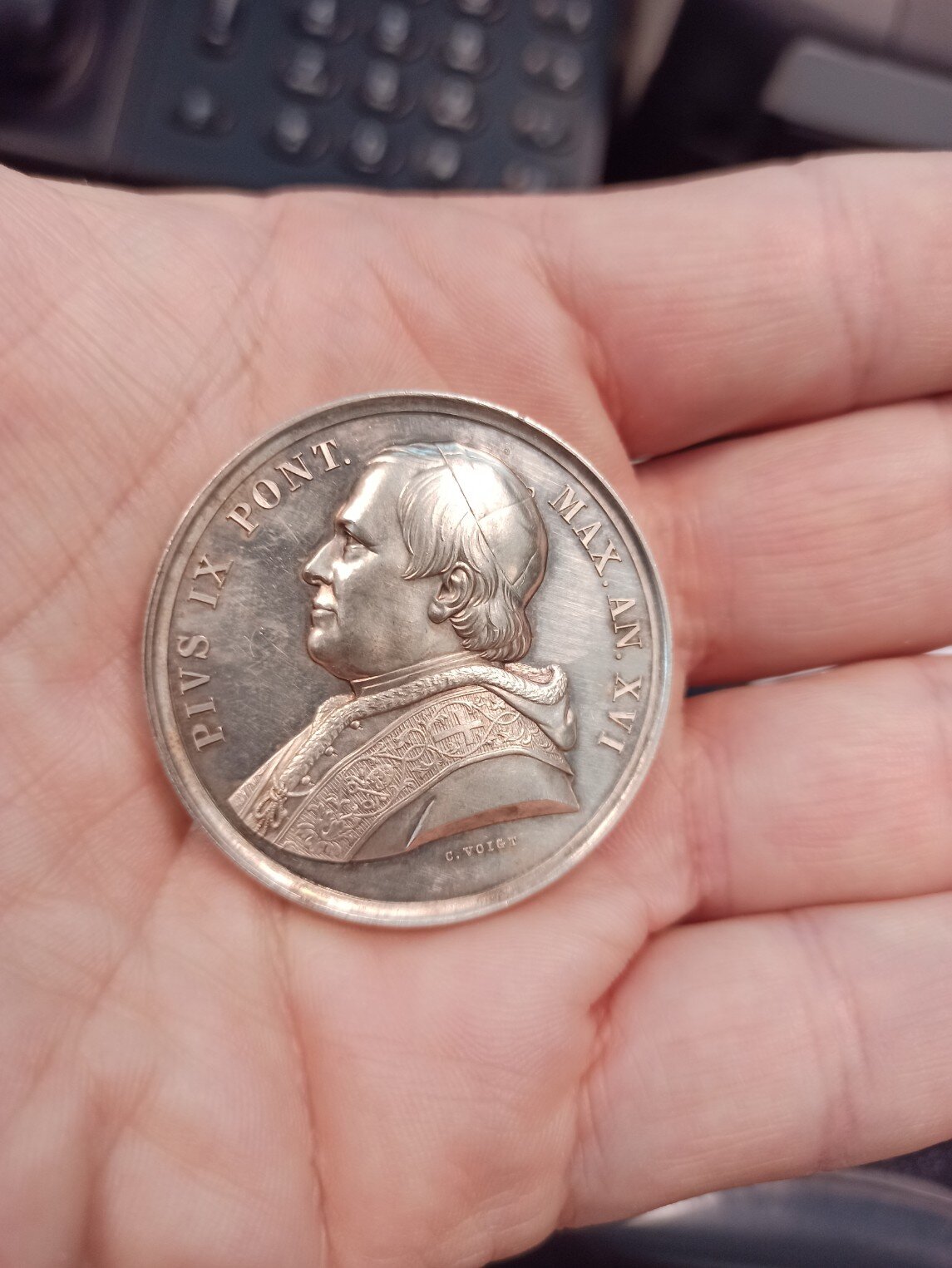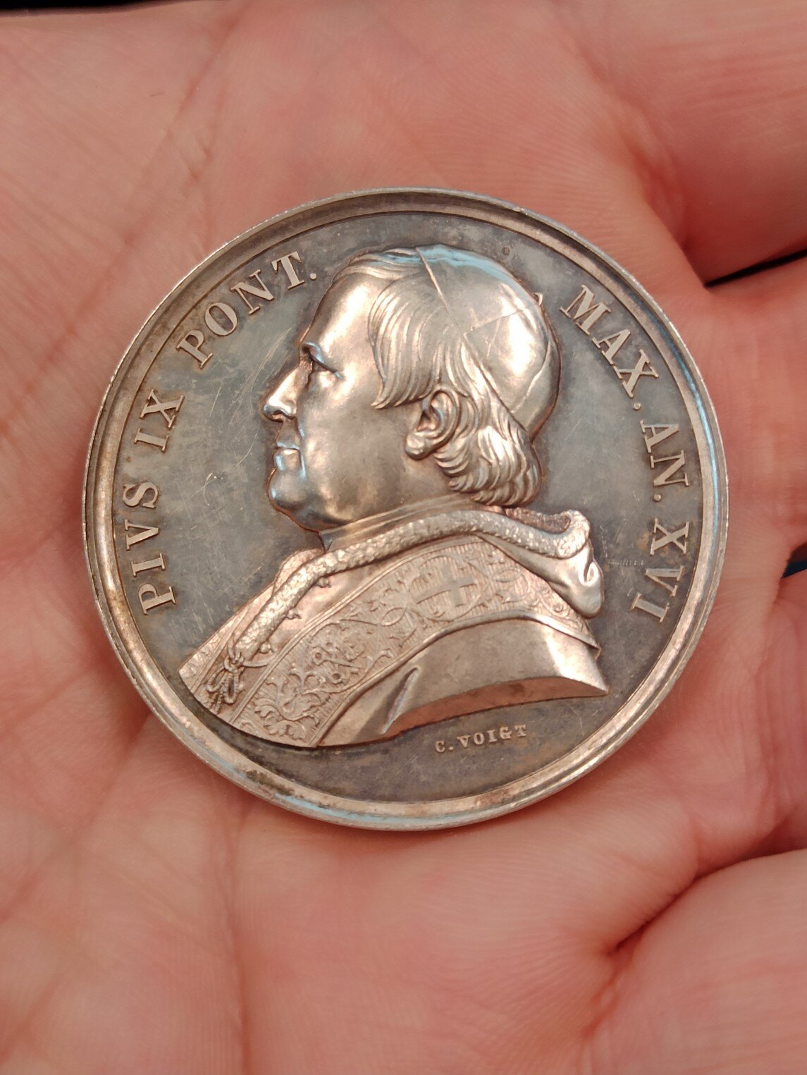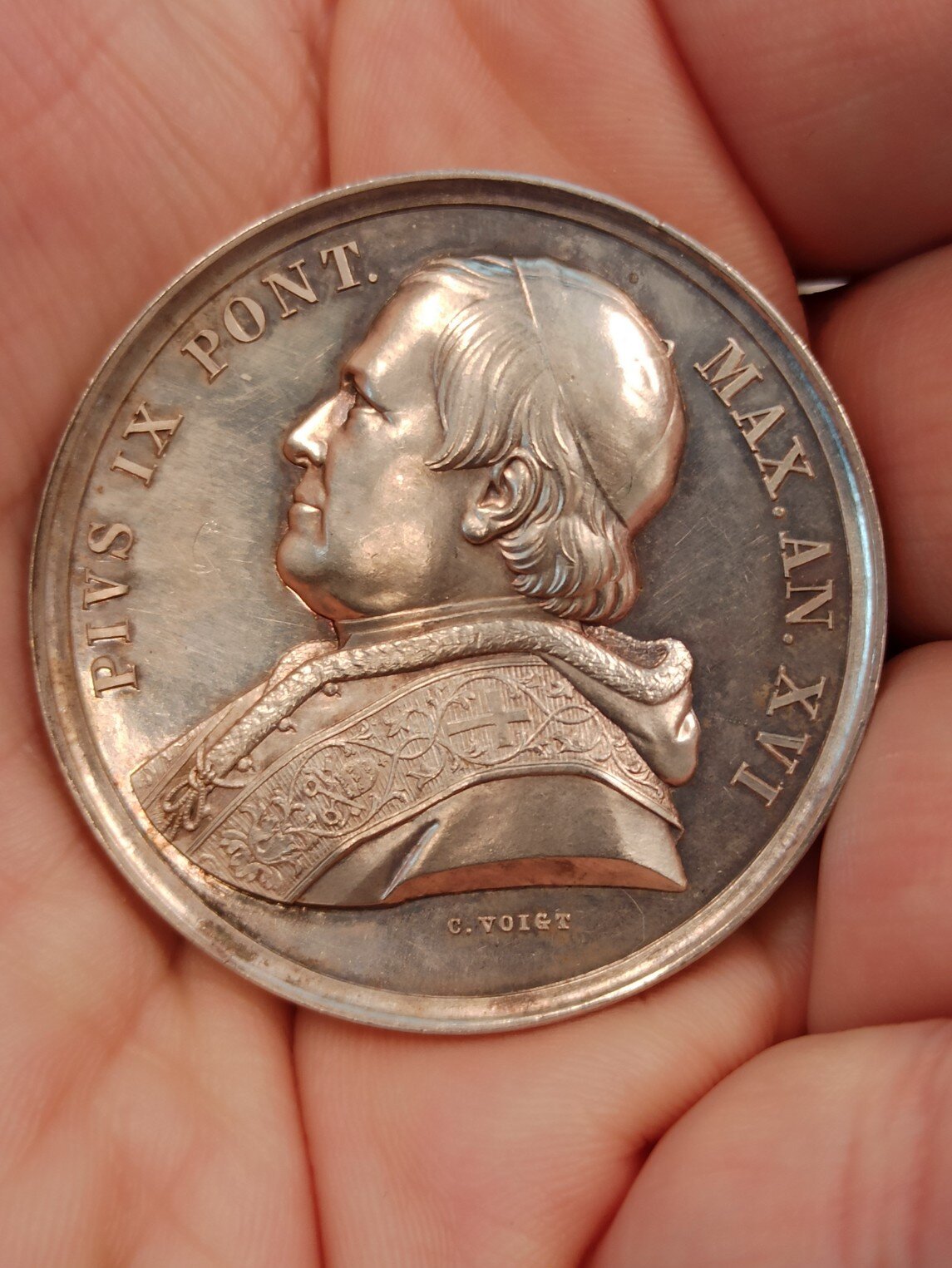 Buongiorno monetiani , lo so sto diventando grave , mi piacciono sempre più oltre alle monete anche le medaglie in argento e non . Vi mostro la mia ultima acquisizione: Stato Pontificio, PIO IX, MEDAGLIA ANNUALE IN ARGENTO, 1861 AN XVI, Contro i nemici dello Stato Pontificio, Opus Carlo Voigt.