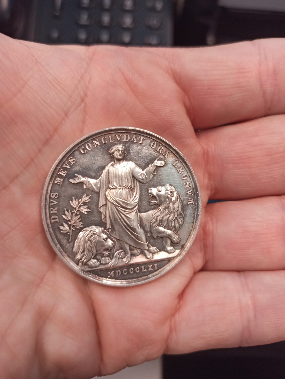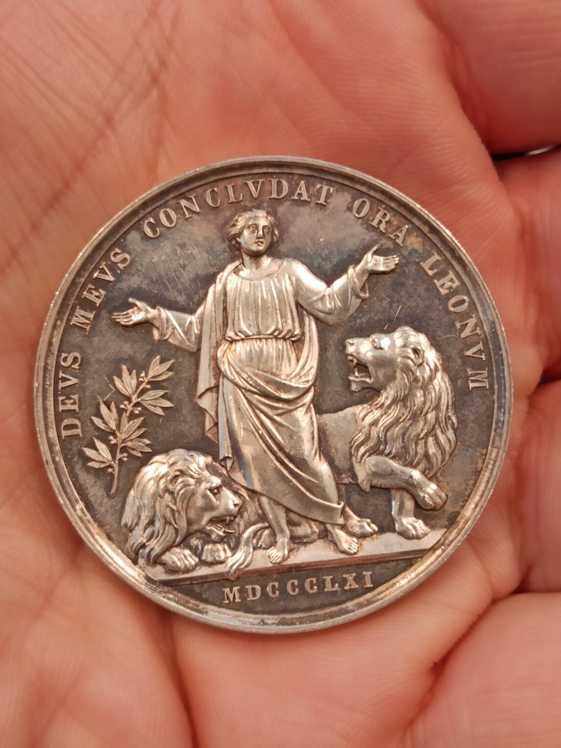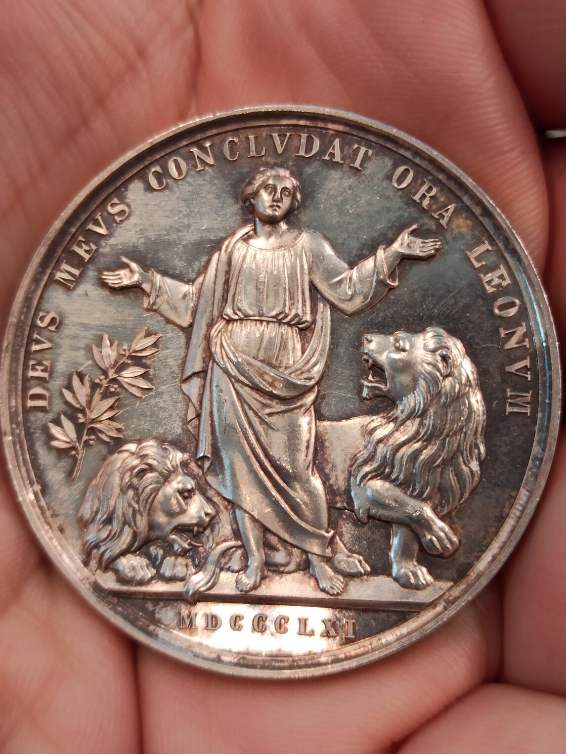 Buongiorno monetiani , lo so sto diventando grave , mi piacciono sempre più oltre alle monete anche le medaglie in argento e non . Vi mostro la mia ultima acquisizione: Stato Pontificio, PIO IX, MEDAGLIA ANNUALE IN ARGENTO, 1861 AN XVI, Contro i nemici dello Stato Pontificio, Opus Carlo Voigt.