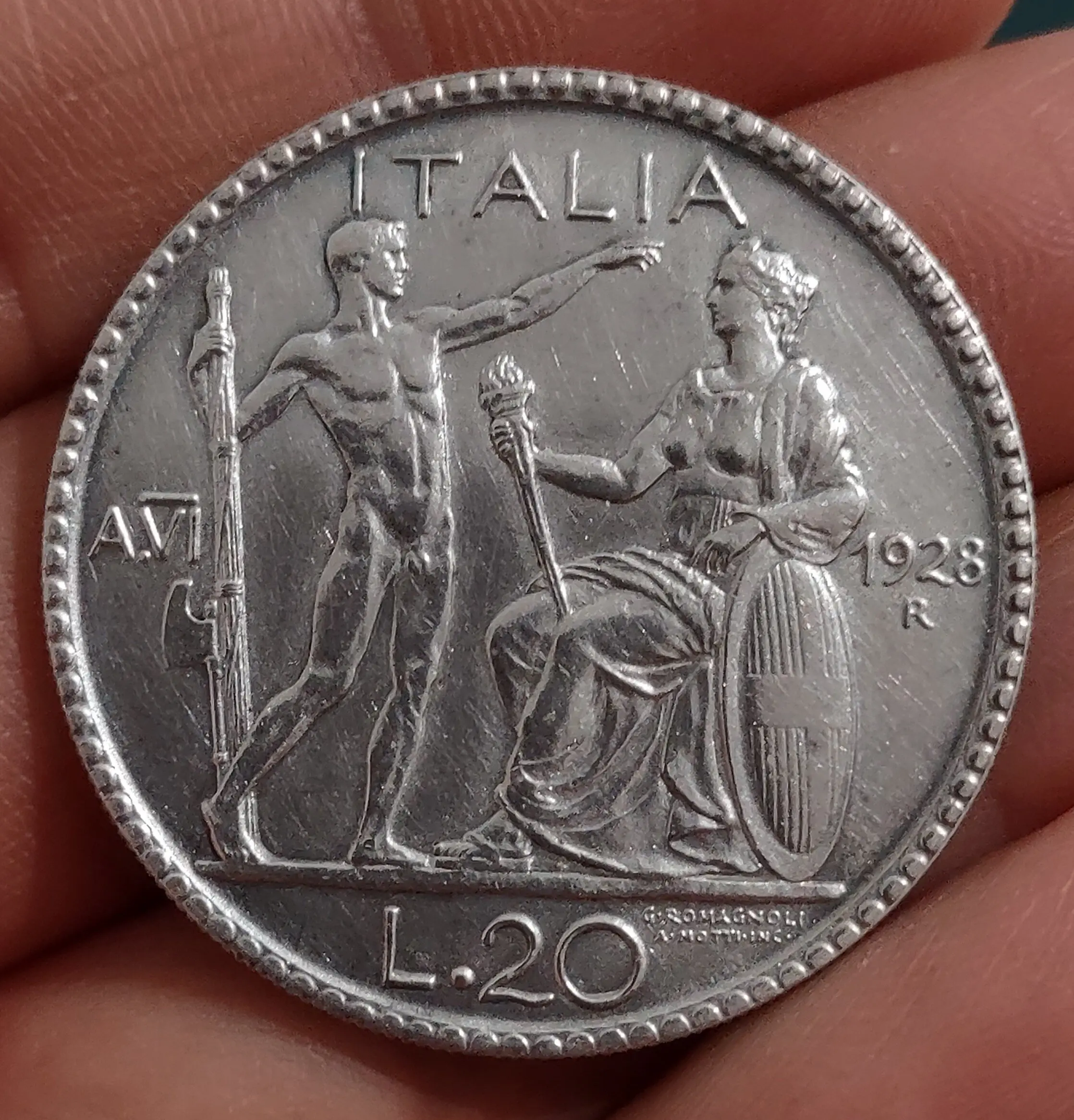 francus Inviato 4 ore fa #1 Inviato 4 ore fa Salve, vorrei un vostro parere su questa moneta da 20 lire 1928. La moneta sembra essere stata spatinata con un metodo meccanico (sotto la luce si vedono parecchi greffietti, che alla luce normale del sole non si notano). Il peso e le misure sono conformi. La moneta mi sembra gradevole e ne sto valutando l'acquisto, per cui se poteste darmi un'opinione anche su un eventuale valore. Grazie mille Cita