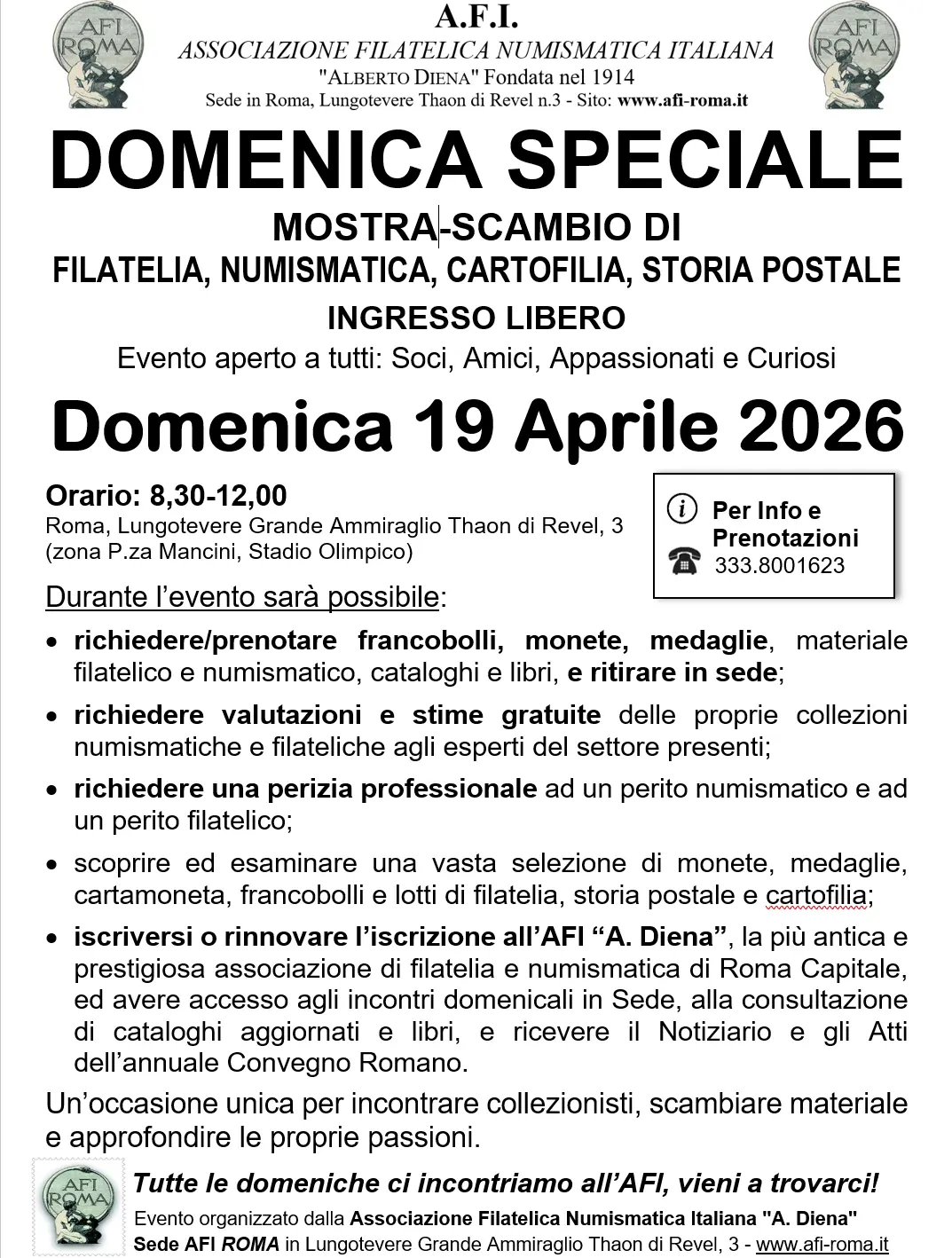 wednes Inviato 18 Marzo #1 Inviato 18 Marzo DOMENICA SPECIALE ALL'AFI "A. DIENA" Roma, Domenica 19 Aprile 2026 ⏳Orario: 8,30-12,30 INGRESSO LIBERO e Parcheggio gratuito ROMA, Lungotevere Grande Ammiraglio Thaon di Revel n.3 (nei pressi dello Stadio Olimpico, Piazza Mancini) Un'occasione per incontrare Collezionisti, scambiare materiale, approfondire e condividere le proprie passioni ! 👉 Evento organizzato dalla Sezione Numismatica della Associazione Filatelica Numismatica Italiana "A. Diena". 👈 Cita