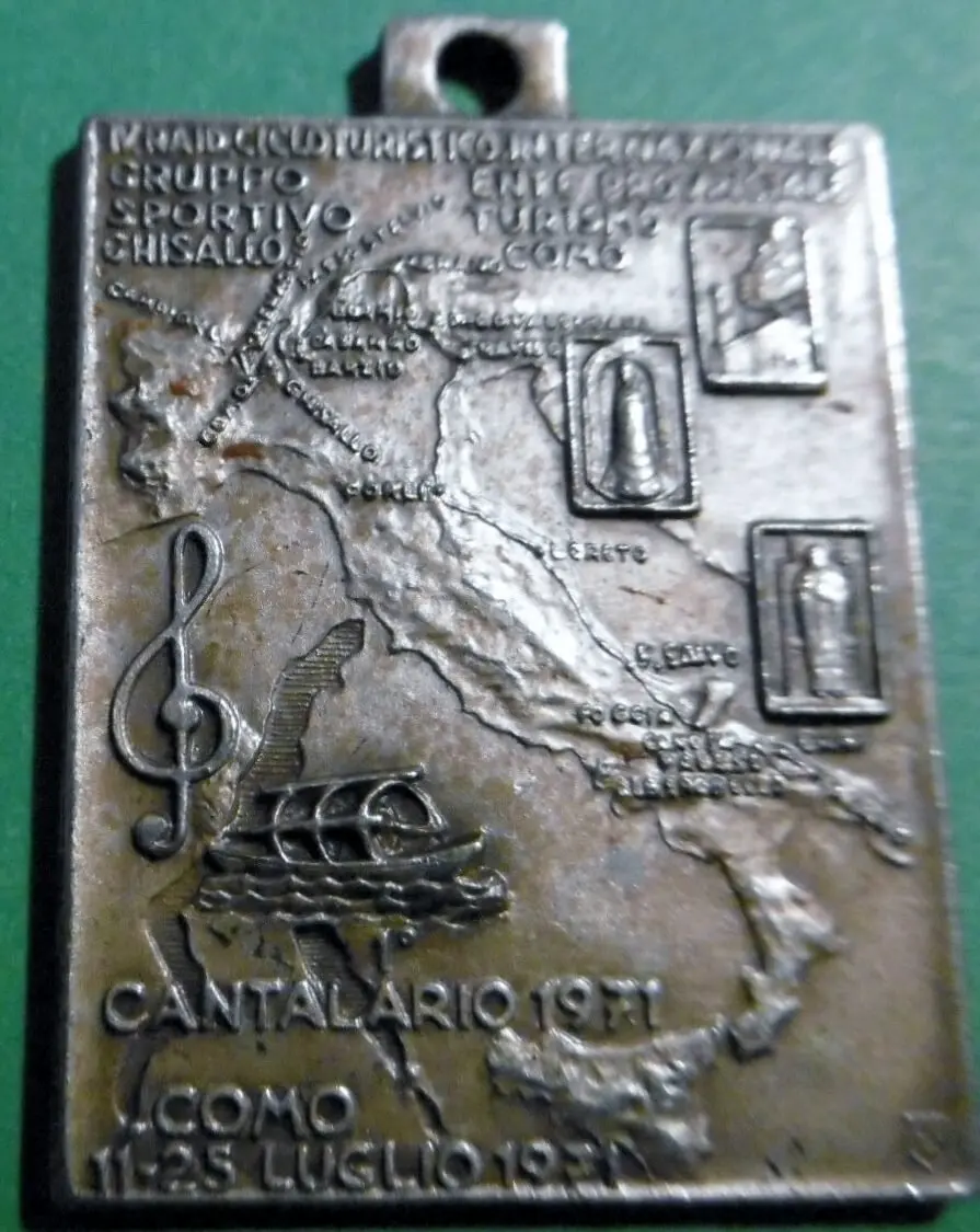 gpittini Inviato 4 ore fa #1 Inviato 4 ore fa DE GREGE EPICURI E' una medaglia uniface, rettangolare, di 30 x 24 mm e 9,29 g. , in metallo bianco. Riproduce l' Italia e, in piccolo, un'antica barca lacustre (Renzo e Lucia!), la chiesa della Madonna del Ghisallo e due immagini mariane. Sulla cartina, una serie di luoghi di tappa dei vari giri ciclistici, da nord a sud. In alto: IV raid cicloturistico internazionale / Gruppo sportivo Ghisallo/ Ente Provinciale Turismo di Como. In basso: Cantalario 1971, COMO, 25 luglio 1971. Cita