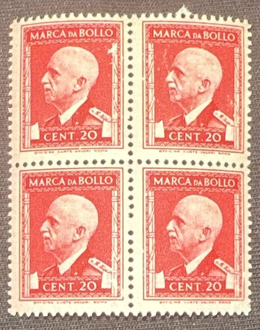 PostOffice Inviato 1 ora fa #3 Inviato 1 ora fa Marche da bollo a tassa fissa, 20c rosso, emissione 1939, filigrana corona, dentellatura 14, dicitura: OFFICINA CARTE VALORI ROMA. Bella quartina "rara" da trovare fresca allo stato di nuovo, a catalogo valgono sui 4/5€ l' una = 20€. Il valore di mercato le vuole al 70% in meno del valore di catalogo, ma qui il valore lo fai tu. Non vanno staccate vanno lasciate come sono.