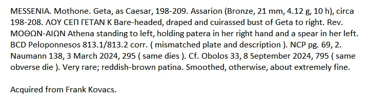 VALTERI Inviato 2 ore fa #1 Inviato 2 ore fa Da Modone nella Messenia peloponnesiaca, , un " Very rare " esemplare in AE per Geta cesare, con al diritto suo busto ed al rovescio figura di Atena con lancia e patera . Sarà a giorni il 3 Maggio, in vendita Nomos 42 al n. 779 . Cita