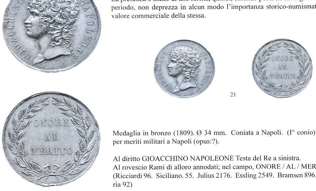 La medaglia di Murat mi sembra sia in ottimo stato conservativo e presenta la classica rottura di conio al dritto tipica di questa tipologia. Si tratta di una medaglia militare a tutti gli effetti. Anche se la coniazione venne decretata nel 1809 venne comunque conferita da Gioacchino Murat negli anni successivi per premiare i militari benemeriti che combatterono con il Re nella campagna di Russia ed in altre battaglie.