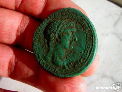 La foto è molto infelice: la moneta si vede di sbieco...i colori sembrano un po'troppo contrastati (la moneta è di un verde smeraldo pazzesco, ma anche le dita sono rosso fuoco!) Certo, la patina non fa una buona impressione, e il ritratto, per quanto "sguanciato", è piuttosto artificioso. Le lettere poi sembrano perfette, fatte ieri.