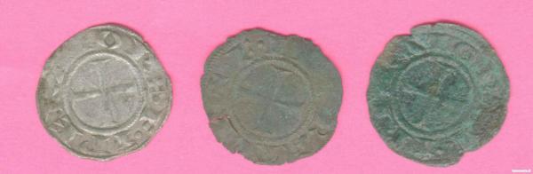Dovrebbero essere tre denari emessi dalla zecca di Messina a nome di Federico II nell'anno 1221-1222 con il titolo sia di imperatore che di Re. Si tratta cmq della stessa moneta, sembrano diverse probabilmente per un diverso contenuto d'argento.