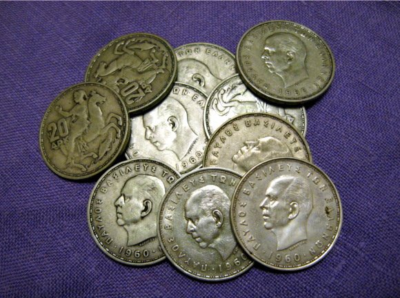 La seconda è una moneta da 20 dracme del 1960, emessa sotto Paolo I (1947-1964), coniata in 20 milioni di pezzi (peso: gr. 7,5, Ag. 835/1000).