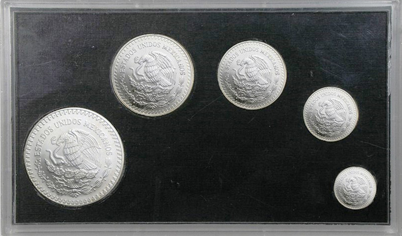 Collezione Libertad 1992 della Banca del Messico in confezione di plastica rigida, composta da cinque monete d’argento .999 del peso di 1 oz, 1/2 oz, 1/4 oz, 1/10 oz e 1/20 oz.
