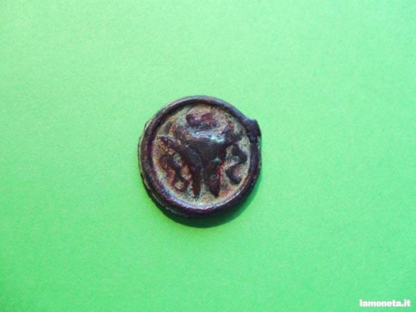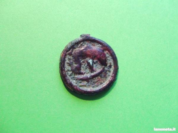 Vi propongo anche questo "potin del bucranio", emesso dai Remi della Gallia Belgica (Brenot n. 1033). Al D. c'è una testa taurina di fronte (bucranio), sormontata da due oggetti imprecisati e circondata da due curve ad esse (serpenti?) Sull'altro lato, un quadrupede verso destra, probabilmente un orso, a giudicare dalla testa, su una linea di terra e con netto grenetis (cerchio di punti).