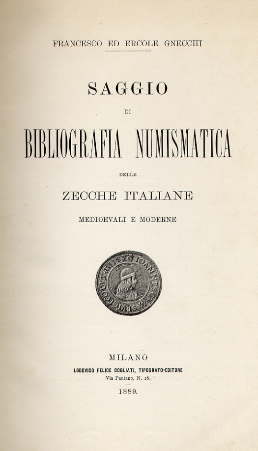 GNECCHI Francesco, GNECCHI Ercole, SAGGIO DI BIBLIOGRAFIA NUMISMATICA DELLE ZECCHE ITALIANE MEDIOEVALI E MODERNE. Milano 1889.