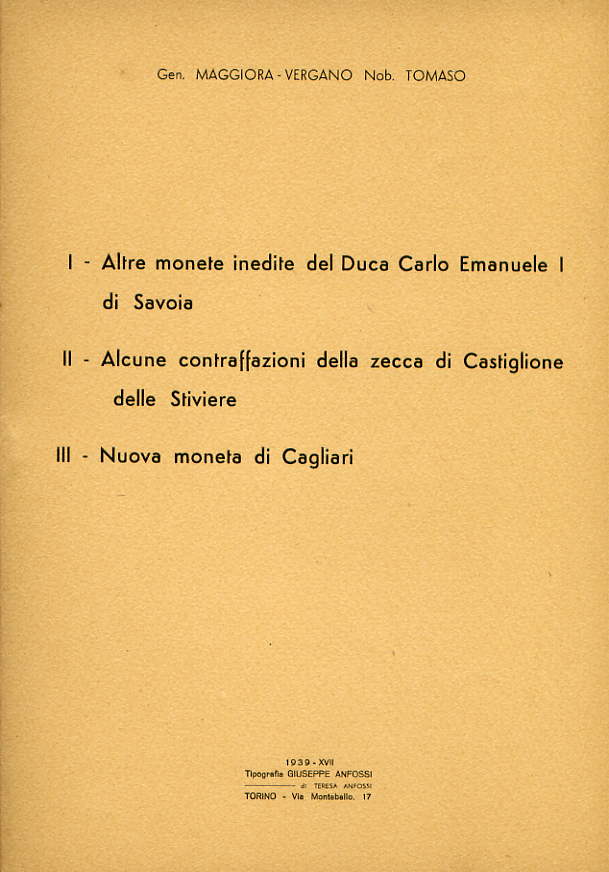MAGGIORA VERGANO GEN.TOMASO Altre monete inedite del Duca Carlo Emanuele I di Savoia - Alcune contraffazioni della Zecca di Castiglione dello Stiviere - Nuova moneta di Cagliari Torino 1939.Tipografia Giuseppe Anfossi