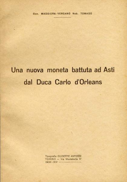 MAGGIORA VERGANO GEN.TOMASO Una nuova moneta battuta ad Asti dal Duca Carlo d' Orleans. Torino 1936.Tipografia Giuseppe Anfossi