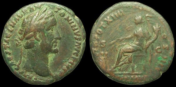Rev:- TR POT XIIII COS IIII / ANNONA AVG (in ex.) / S - C, Annona seated left holding cornucopia and grain over modius