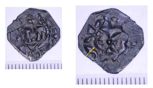 Sul nuovo esemplare (a destra), benché la legenda sia meno chiara, abbiamo un certo numero di punti a comune con il precedente (a sinistra) che ritengo significativo. Ad esempio, guardando la parte iniziale della legenda, per capirci dove dovrebbe essere la H di EHrICVS, vediamo un gancio che nel caso della moneta di sinistra avevamo ipotizzato potesse essere una r seguita da una E, e questo porterebbe a pensare a legende del tipo FREDERICVS o varianti. Non era chiara, invece, la possibile C di LVCA, anche se sia io che @margheludo abbiamo in un primo momento pensato all'identificativo della tipologia "volterrana" (VVLT').