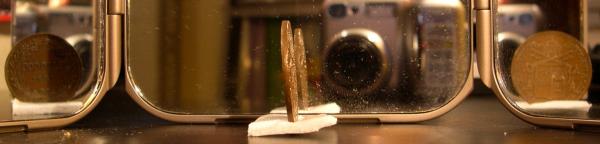 Io suggerirei di mettere la moneta in verticale e fotografare il rovescio dopo aver posizionato uno specchio dietro la moneta. Con uno scatto solo inquadrerai così rovescio e dritto riflesso su specchio.