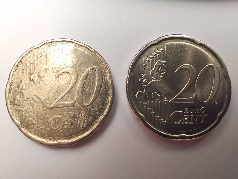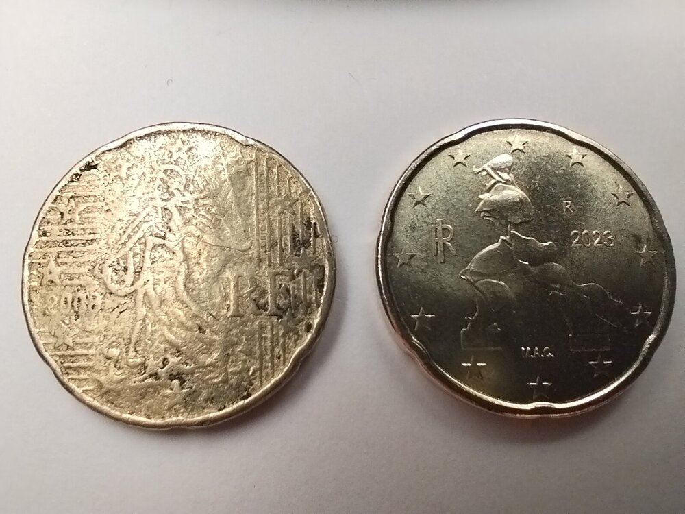 Piccola parentesi: diverso tempo fà ho sentito affermare qualcuno (non in questo forum) che tali obbrobri siano monete originali prodotte e scartate direttamente alla zecca, ed escono così per gravi problemi di base al tondello. Però secondo il mio parere tale affermazione è inesatta, oltretutto non proviene da fonte attendibile ma da classica "voce di corridoio".