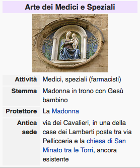 A Firenze era la protettrice dell'Arte, ad esempio; Arte a cui anche Dante si era iscritto (in realtà solo per poter fare politica, condizione che presupponeva appunto l'iscrizione a un'arte, per cui tanto valeva iscriversi alla più prestigiosa) e la sua immagine compare nella prima edizione del "Ricettario fiorentino" stampato il giorno XXI di genaio MCCCCLXXXXVIII (ab incarnatione, e quindi in realtà 1499) dal Famosissimo Collegio degli esimi dottori della arte e medicina della inclipta ciptà di Firenze, ad instantia della Signori Chonsoli della università degli speziali.