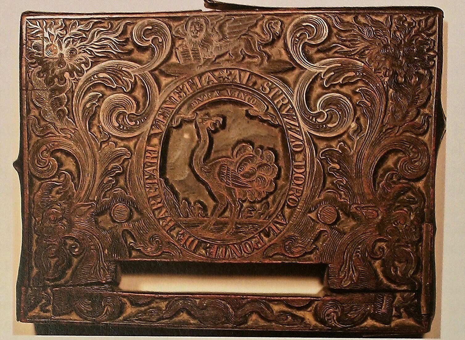 Rectangular wooden stamp for theriac labels, depicting ostrich and lions of St. Marks, from Venice, Italian, 1601-1800.