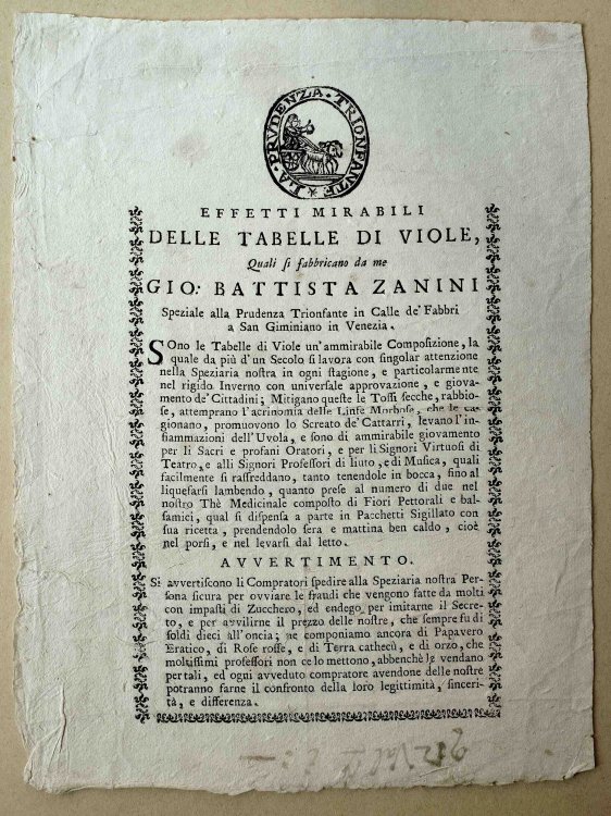 I foglietti volanti che accompagnavano i rimedi erano, almeno a Venezia, obbligatori e soggetti a “registrazione” al pari del medicamento stesso; poi, alcuni erano “regolari” e altri no ma