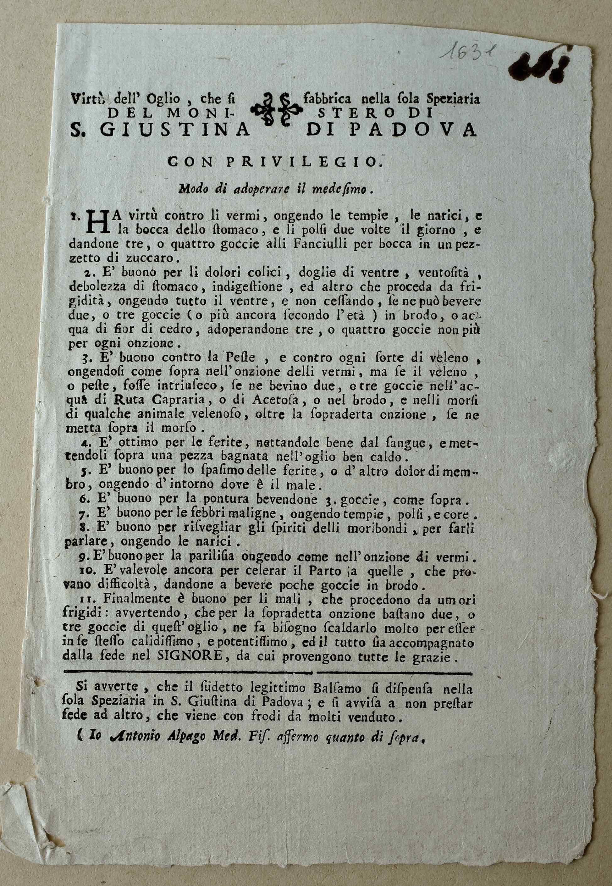 Non sarei per nulla certo che il foglietto del "Balsamo oleoso volatile" sia fraudolento. A Venezia, chiunque volesse vendere un rimedio medicinale -che non fosse preparato estemporaneamente in una spezieria da uno speziale dietro presentazione di una ricetta di un medico fisico-, indipendentemente dal fatto che a volerlo vendere fosse un medico, uno speziale, un ciarlatano (spesso erano figure assolutamente legittimate a farlo anche loro, ciarlatano non era inteso nell'accezione negativa di oggi) o un semplice privato cittadino, doveva fare domanda ai competenti organi sanitari della Serenissima che ne valutavano la non pericolosità per la salute pubblica, l'efficacia e l'originalità in collaborazione col Protomedico (famosissimo il Paitoni) e poi concedevano, o meno, la licenza di vendita (o addirittura il Privilegio, in casi particolari). Era a tutti gli effetti una sorta di "registrazione" ante litteram necessaria per poter vendere dei rimedi "OTC" del tempo. Ed era fatto obbligo accompagnare il rimedio con un "bugiardino" parimenti autorizzato. Il fatto che qui si citi una spezieria realmente esistente farebbe pensare ad un rimedio realmente venduto da quella spezieria in quel periodo. Per quanto riguarda le molte potenzialità decantate, era tipico del periodo e sostanzialmente in linea con quanto riportato per la maggioranza di questo tipo di rimedi. E non necessariamente a fini di inganno, semplicemente, alla luce delle magre conoscenze dell'epoca, si credeva realmente nell'efficacia di questi rimedi.