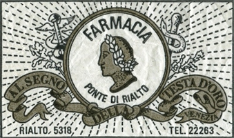 Logo d’epoca della farmacia “Al Segno della Testa d’Oro” a Ponte di Rialto in Venezia.