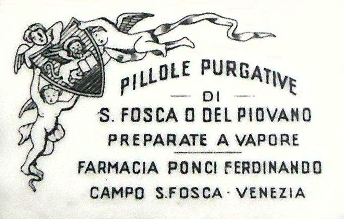 Sono pillole aloetiche di grande efficacia purgativa, la cui produzione e vendita era un’esclusiva della spezieria in campo S. Fosca all’insegna dell’Ercole d’oro. Le pillole sono di origine antichissima e, secondo la tradizione, furono inventate da un parroco della chiesa di S. Fosca vicina alla farmacia. Da qui il loro nome in quanto ‘piovano’ (o ‘pievano’) è il prete che ha il governo spirituale della gente che abita nel perimetro della sua parrocchia. Le pillole sono state presentate e reclamizzate da molti manifestini illustrati, alcuni dei quali estratti da riviste dell’epoca si trovano ancora oggi in vendita in rete, come quelli che descrivo qui e a seguire, presi dalla cosiddetta ‘baia’.
