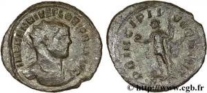 Rev. PRINCIPIA IV-VENTVTIS / AQT Crispus as Princeps Iuventutis helmeted, standing l. in military attire, wearing boots, holding spear in his l. hand, large shield at his side with his r. hand.