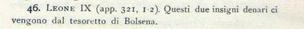 Gli ultimi due esemplari illustrati dalla tavola 46 del Serafini meritano lesposizione delle considerazioni di Philip Grierson tratte dal un suo articolo del 1965 (P. Grierson HENRICVS IMP or ALBRICVS PRINCIPS. A note on the supposed denaro of Pope Leo IX (1049-54) and Henry III, Numismatiska meddelanden XXX, Stockholm 1965, pp 51-56) (anche in Dark Age Numismatics, Londra 1979, XXIX).