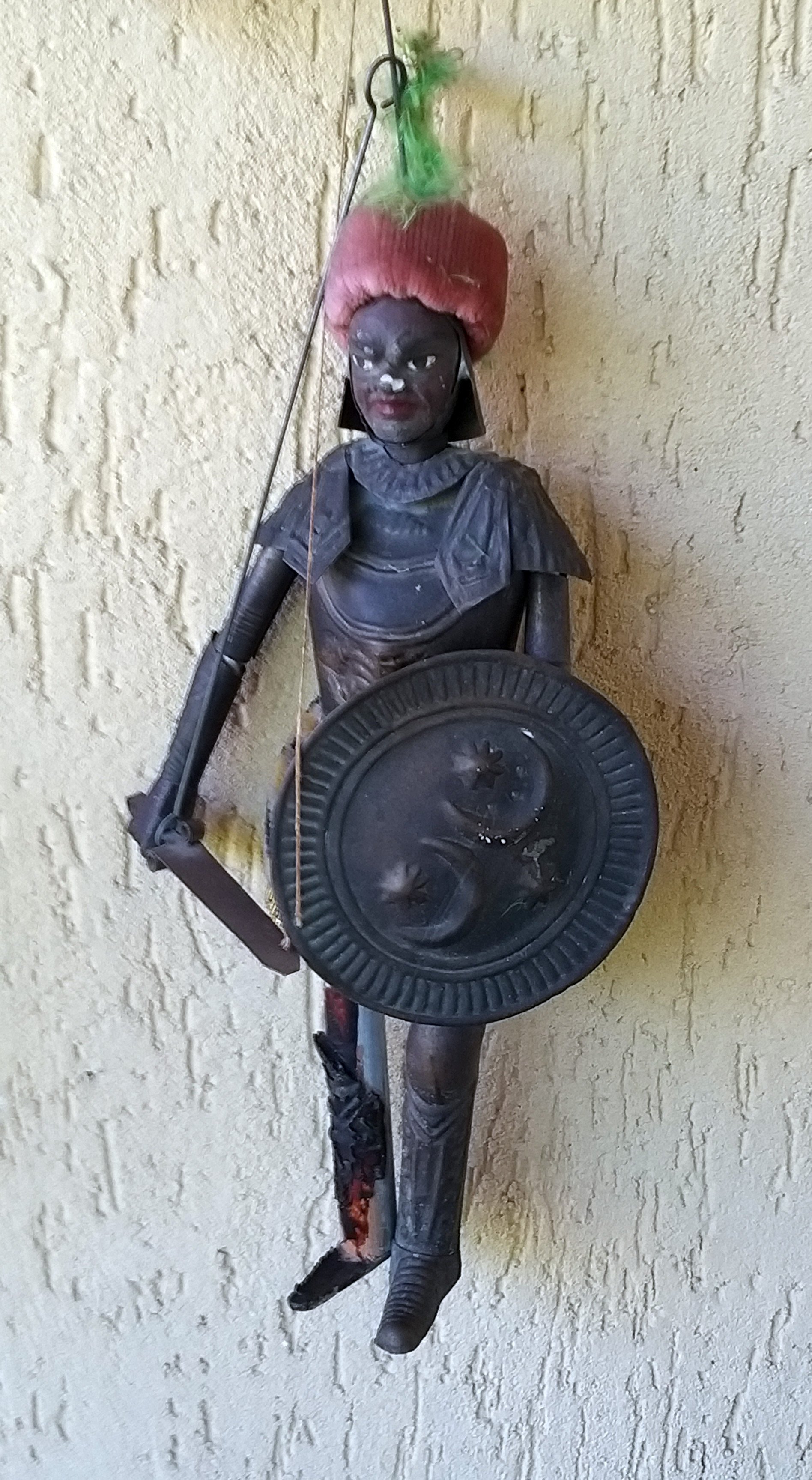 Antico burattino guerriero saraceno con armatura metallica.