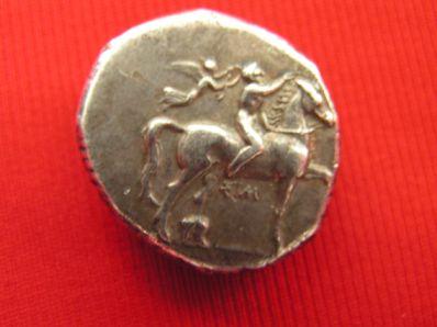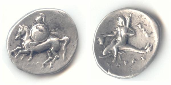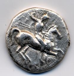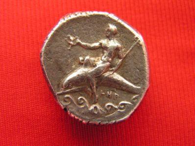 R.) Taras a cavallo di un delfino con la mano destra tiene una torcia e una canocchia nella sinistra, nel campo a dx lettere ANT (theta) legenda TARAS (sigma)