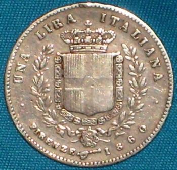 nella mia raccolta mi ritrovo questa moneta, 1 lira italiana 1860, zecca Firenze, che al dritto riporta curiosamente il collo del Re "tagliato", come le lire successivamente coniate.