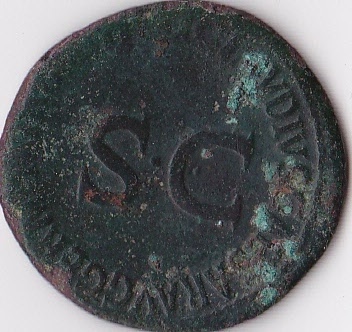 La moneta ha due grandi lettere S e C con un punto tra le due e tutto intorno ha delle lettere di cui alcune non si leggono più ma altre si..le lettere visibili sono: VDIVSCALSARAVGGERM