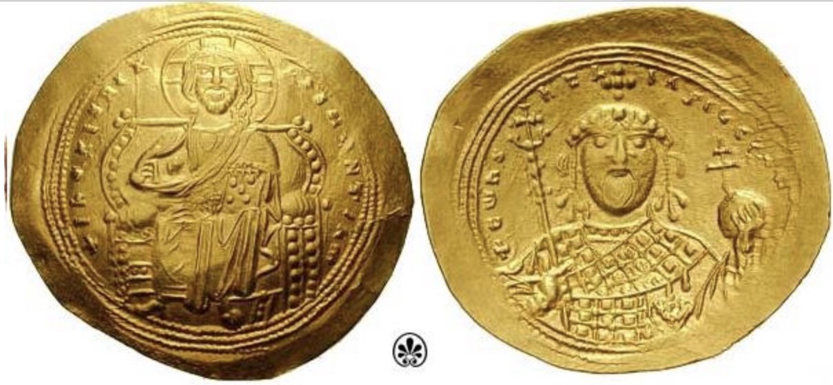 Il problema è che Costantino IX Monomaco fa parte della casta civile ed era quindi un funzionario amministrativo e non militare prima di diventare imperatore. La presenza della spada sulle sue monete è quindi di maggior valore rispetto a Isacco I. E la presenza delle due stelle, a mio avviso, ne sottolinea l'importanza.
