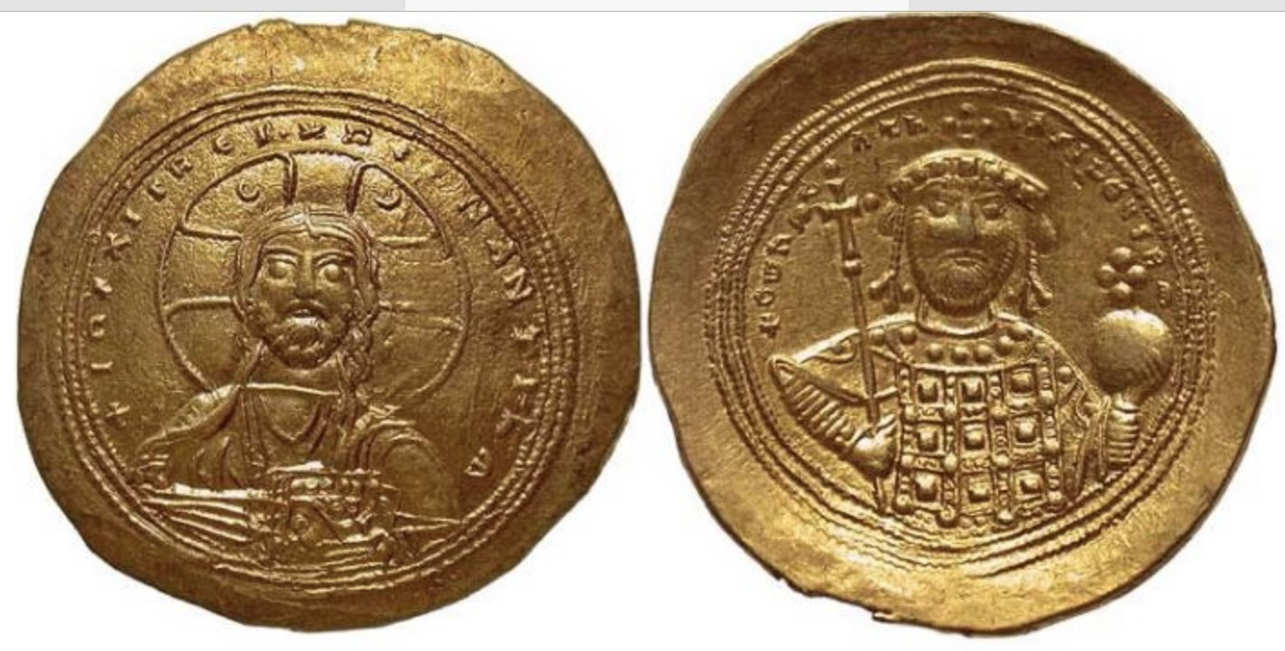 L'utilizzo della spada nell'iconografia bizantina è piuttosto raro. Soprattutto sull'oro che era moneta internazionale, dove l'imperatore appariva più come una persona divina e quindi priva di elementi crudemente terreni. La spada quindi diventava un messaggio, soprattutto per i nemici e per questo credo che negli ultimi anni di Costantino IX ci siano stati eventi militari di un certo rilievo (magari le prime lotte contro i turchi).