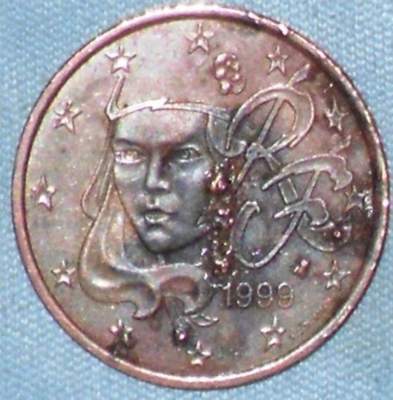 tra gli spiccioli di resto ho trovato questo curioso esemplare di 5 centesimi 1999, francese , che presenta sia al dritto che al rovescio delle escrecenze di metallo in rilievo. La moneta è molto circolata e credo che sia uscita così dalla zecca.