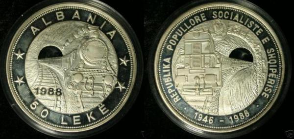 Riguardo alla monete dell'Albania ho quella in argento da 50 leke con il buco in corrispondenza della galleria (5 once), esiste anche da 10 once senza buco però è molto rara la tiratura è di soli 200 pezzi.