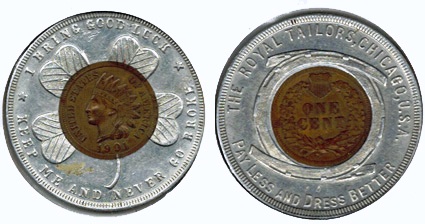Si è detto che per questi gettoni venivano usate monete di piccolissimo valore, cents, nickels o, al massimo, dimes, come potete anche constatare dal link del post precedente. Ma non mancarono le eccezioni, soprattutto da parte di chi vendeva prodotti di prestigio, e prezzo di conseguenza, e poteva quindi permettersi di regalare alla propria clientela qualcosa di più di un centesimo Lincoln :D