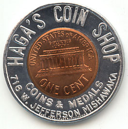 Encased coins, monete racchiuse, o incassate, in taliano, sono dei gettoni che hanno al centro una moneta, di solito di piccolissimo valore, 1 centesimo o poco più, mentre il cerchio esterno, generalmente in alluminio, riporta su un lato la pubblicità delle più svariate attività commerciali. Nel mio, quella dell' Haga's Coin Shop - Coins & Medals di Mishawaka, Indiana.