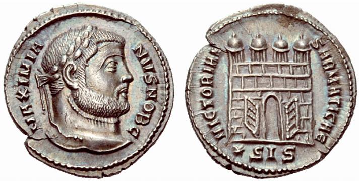 Galerius Maximianus, 305-311. Caesar 293 – 305. As Caesar. Argenteus c. 294/295, Siscia. MAXIMIA – NVS NOB C Head, laureate, to r. Rev. VICTORIAE – SARMATICAE Camp gate with four turrets and gates flung open. à