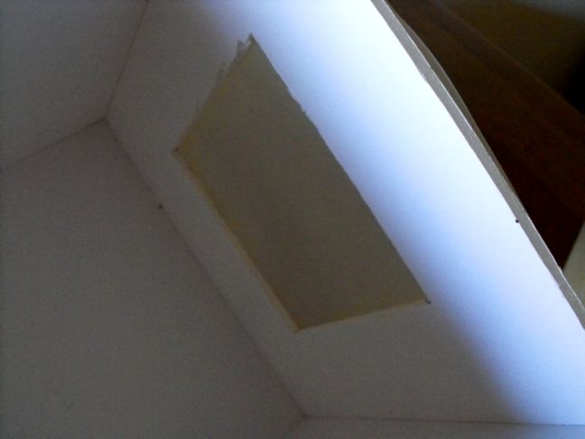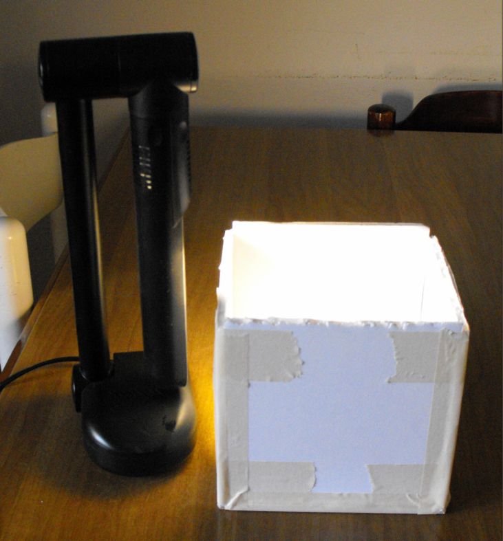 Queste fotografie le ho fatte mettendo una lampada con la luce al neon vicino alla finestrella, la luce inonda l'interno della scatola riflettendosi sulle pareti bianche.