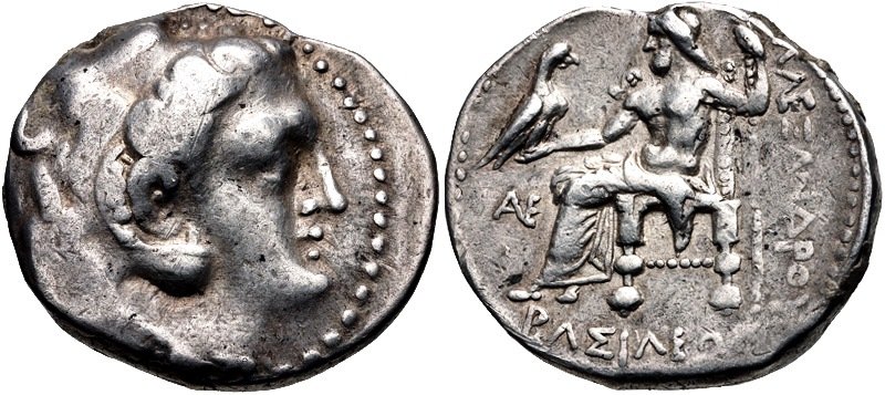 MAKEDONISCHE KÖNIGE. Alexander III. der Große, 336 - 323 v. Chr. Tetradrachme (16,71g). ca. 323 - 317 v. Chr. Mzst. unbestimmt in Phönizien. Vs.: Kopf des Herakles mit Löwenfell n. r. Rs.: ΒΑΣΙΛΕΩΣ ΑΛΕΞΑΝΔΡΟΥ, Zeus mit Adler auf der R. nach l. thronend, l. im Feld AE (in Ligatur). Price 3565; Müller 1649; Meydancikkale Hoard 1970­72.