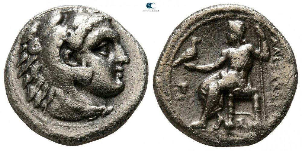 Tetradrachmon, 300-281, Mylasa (?). Kopf des jugendlichen Herakles im Löwenskalp rechts. Rs: ALEXANDROU. Zeus mit Adler und Szepter auf Thron nach links sitzend, im Feld links Figur der Artemis Kindyas en face.
