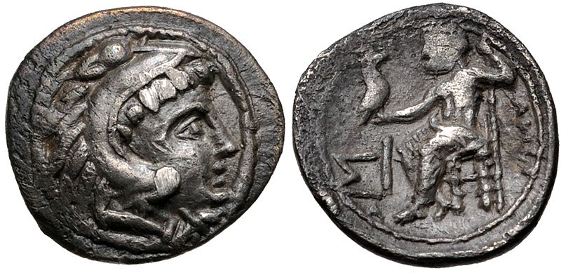 KINGS of MACEDON. Philip III Arrhidaios. 323-317 BC. AR Obol (10mm, 0.68 g, 1h). In the name and types of Alexander III. Babylon mint. Struck under Archon, Dokimos, or Seleukos I, circa 323-318/7 BC. Head of Herakles right, wearing lion skin / Zeus Aëtophoros seated left; M in left field, ΛY above strut of throne. Price 3696. VF, toned, slightly off center on obverse.