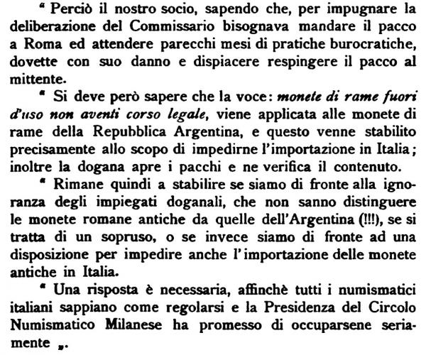 Per farla breve ci si lamentava delle nuova disposizione, dichiarando che questo avrebbe segnato la fine del collezionismo numismatico...che era un idiozia perchè i commercianti esteri facevano incetta mentre noi italiani eravamo penalizzati...che è facile nascondere le monete ai doganieri perchè sono oggetti piccoli...che quest'ultimi erano degli incompetenti che non sapevano distinguere monete romane da monete contemporanee... (mi ricorda qualcosa di già sentito... :rolleyes:)