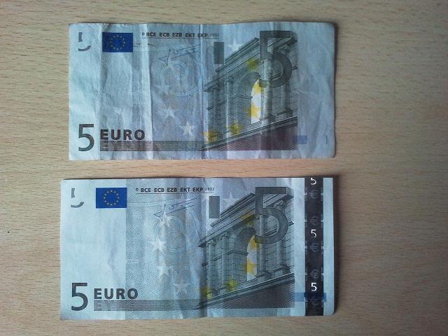 Ho trovato una banconota da 5 Euro diversa dalle altre, ho notato immediatamente un particolare sospetto...mancava la striscia olografica sul lato destro della banconota. Primo pensiero ...E' FALSA! Così l'ho fatta subito controllare con un rilevatore di banconote false che mi ha dato torto perché è autentica. Il passo successivo è stato quello di confrontarla con un'altra banconota dello stesso taglio....