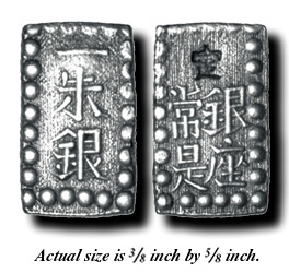 La piccola invece è uno Shu (Isshu Gin) in argento 968/1000 x 1,89 grammi, databile dal 1853 al 1865, emessa in 159.245.000 esemplari.