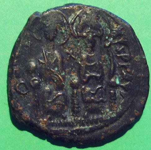 Ho diversi follis di Giustino con Sofia; questo è di Costantinopoli, officina epsilon; non sono sicuro che quella specie di G che sta a dx sia un 6 (VI anno di regno, quindi). A parte ciò, in questa moneta, ma ancor più in altre, le figure dei due sovrani sono fortemente stilizzate; sembrano disegnate da un bambino, ma fanno anche pensare a due alieni. Come si potrebbero definire in termini artistico-estetici? Stamane un amico sosteneva: potrebbero essere stati incisi da Basquiat, sicuramente non da Benvenuto Cellini (e neppure da Eveinetos, aggiungerei).