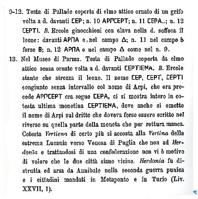 Il Garrucci, nella sua nota opera "Le monete dell'Italia antica" del 1889, p. 112-113, scrive: